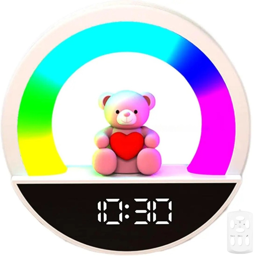 Lampa de veghe pentru copii cu design de ursulet este solutia perfecta pentru un somn linistit si confortabil. Ofera 10 niveluri de luminozitate reglabila, trei moduri de iluminare (alb cald, alb rece, lumina colorata) si un ceas integrat cu cifre mari, usor de citit. Este echipata cu telecomanda si functie de temporizare automata (15/30 minute), ideala pentru camera copilului, holuri sau birouri. Fabricata din material ABS de calitate superioara, cu durata de viata de pana la 50.000 de ore, lampa este compacta, practica si perfecta ca decor sau cadou.