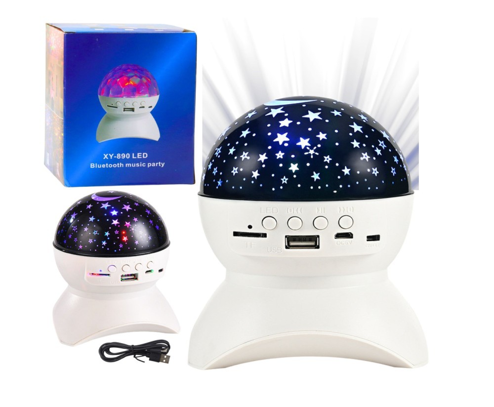 Proiectorul de stele LED XY-890 este o lumina de noapte multifunctionala care combina o iluminare puternica cu posibilitatea de a reda muzica prin intermediul unui difuzor incorporat. Dispozitivul creeaza modele frumoase pe pereti si tavane.. Proiector LED cu stele, difuzor Bluetooth, lampa de noapte, USB SD, alb XY-890. Proiectorul de stele LED XY-890 este o lampa de noapte multifunctionala care combina o iluminare izbitoare cu posibilitatea de a reda muzica datorita difuzorului incorporat. Dispozitivul creeaza modele frumoase si dinamice pe pereti si tavan, amintind de un cer instelat. Este decorul perfect pentru camera unui copil, dormitor, living si serveste, de asemenea, ca element decorativ suplimentar pentru petreceri si reuniuni de familie.. Proiectorul este echipat cu Bluetooth, un port USB, un slot pentru card micro SD si un port de incarcare de 5V CC. Acest lucru va permite sa redati muzica de pe telefon, stick USB sau card de memorie. Bateria reincarcabila incorporata si difuzorul surprinzator de puternic fac dispozitivul practic si portabil. Lampa va permite sa schimbati culorile stelelor, sa reglati volumul, sa schimbati pistele si sa activati sau sa dezactivati efectul de lumina.. Modelele in forma de stele creeaza o atmosfera placuta si calma – perfecta pentru copii, care pot fi, de asemenea, distrati cu cantece de leagan sau povesti. Proiectorul functioneaza bine si ca element decorativ pentru petreceri acasa, evenimente speciale sau seri tematice, oferind camerei un caracter unic. Este un plus functional, atragator si practic pentru orice interior.. SPECIFICATII:. Material: Plastic de inalta calitate. Tip de lumina: LED-uri. Efect de lumina: Cer instelat, stele care isi schimba culoarea. Moduri de functionare: iluminare LED, proiectie, redare audio. Bluetooth: Da. Intrari: USB, micro SD. Alimentare: CC 5V. Putere: 10W. Difuzor incorporat: Da. Baterie incorporata: Da. Culoare: Alb. Dimensiunile lampii: 14 x 11 cm. Dimensiuni pachet: 15 x 11,5 x 11,5 cm. Comenzi: Butoane functionale. Functii butoane: Redare/Pauza, piesa urmatoare/crestere volum, piesa anterioara/reducere volum, LED pornit/oprit, Pornit/Oprit. Scop: Camera pentru copii, dormitor, relaxare, decorare, petreceri