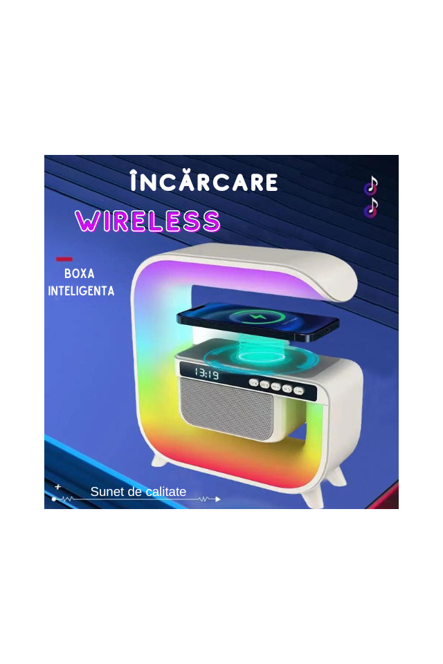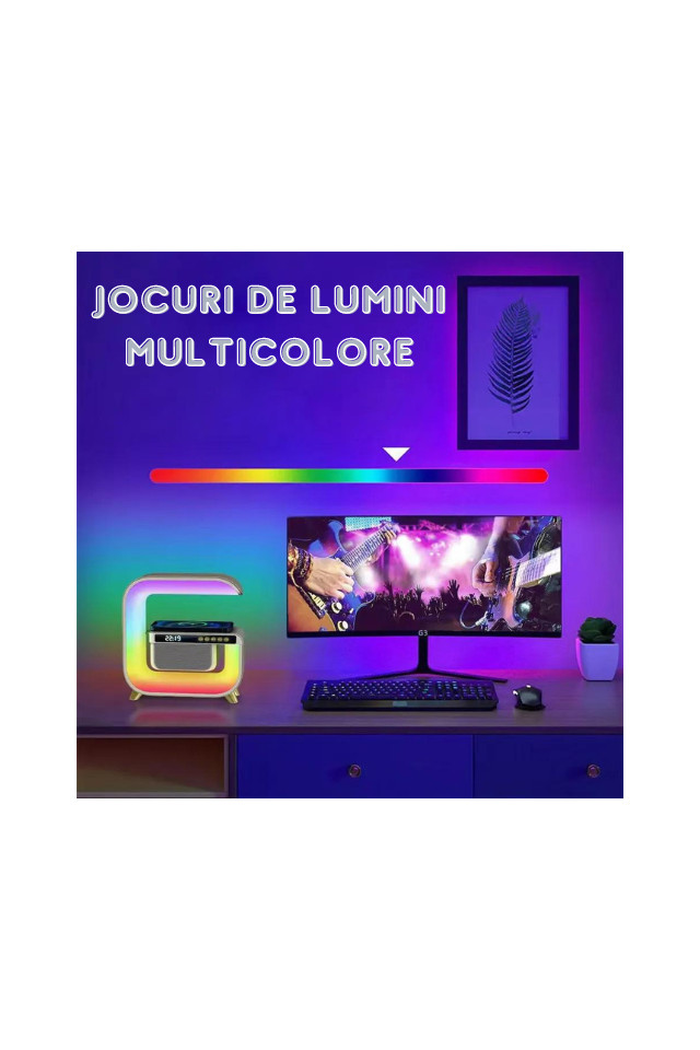 Lampa Smart LED RGB, 5 in 1, boxa Bluetooth, FM, Aux, incarcare Wireless rapida, Ceas cu alarma, 256 Jocuri de lumini multicolore, Aplicatie mobila pe
