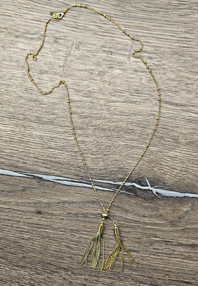 Lant dama finut din metal cu finisaj auriu lucios. Este decorat cu doi ciucuri subțiri, realizați din multiple fire, atașați la un element central rotunjit. Lanțul prezintă detalii fine, cu mici biluțe integrate.
