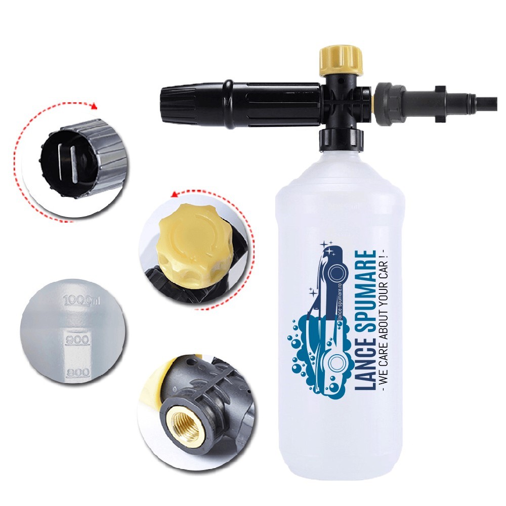 Lance spumare profesionala dedicata aparatelor de spalat cu presiune ale producatorului Heinner COMPATIBILITATE SI DIVERSITATE COMPATIBILITATE LANCE SPUMARE HEINNER: aparatele de spalat cu presiune ale producatorului HEINNER! Compatibil cu aparatele de spalat cu presiune HEINNER, modelul VSP0001, etc. Daca detineti un aparat Heinner care are un adaptor ale carui dimensiuni nu sunt identice cu cele din imagini contactati-ne pentru a va indruma in alegerea adaptorului corect si potrivit necesitatilor dumneavoastra, in situatia in care nu regasiti un adaptor cu aceleasi dimensiuni ca ale celui pe care il detineti la niciunul dintre produsele noastre! Pentru alegerea corecta a tipului de lance de care aveti nevoie trebuie sa cunoasteti marca si modelul aparatului pe care il detineti, alegand tipul de adaptor potrivit nevoilor dumneavoastra. Magazinul nostru dispune de o gama larga si diversificata de adaptoare pentru orice model de aparat de spalat cu presiune din care puteti alege ceea ce va este necesar! Puteti vizualiza oferta completa de adaptoare disponibile dand click aici! DESPRE PRODUS Aceasta lance de spumare este un produs profesional destinat in special spalarii masinii dumneavoastra, fara a se limita insa la aceasta intrebuintare. Aceasta se utilizeaza impreuna cu spuma activa sau alte solutii de curatat exteriorul autovehiculului, realizand o spuma densa de aceeasi consistenta ca a celei obtinute la spalatoriile auto cu ajutorul nebulizatorului. Pentru realizarea acestei operatiuni nu aveti nevoie decat de aceasta lance, spuma activa si un aparat de spalat cu presiune (fara a mai avea nevoie de nebulizator). Calitatea materialelor este premium, corpul lancei fiind realizat din plastic, iar adaptorul este realizat, de asemenea, pentru toate modelele din aceasta categorie, din plastic (cu baza din alama) sau din metal (alama sau otel inoxidabil), dupa caz. Lancea are reglaje atat pentru forma jetului de spuma, cat si pentru coeficientul de infoiere al acesteia (consistenta), pe care le veti selecta in functie de gradul de murdarire al masinii, dupa cum puteti vedea si in imaginea de mai jos. Spre deosebire de lancile realizate din metal, modelul din plastic nu permite inlocuirea elementelor componente in cazul defectarii, corpul acestui model fiind turnat. In schimb insa, acest model prezinta avantajul ca atat corpul lancei de spumare (facem referire la duza de aspiratie ce include partea de infiletare) cat si recipientul gradat sunt realizate din plastic, evitandu-se astfel uzura prematura a filetului recipientului gradat (cauzata de diferenta de duritate dintre cele doua materiale folosite). DETALII TEHNICE SI RECOMANDARI Retineti faptul ca lancea vine cu duza de 1.1 mm premontata, fiind recomandat a se folosi cu aparate ce debiteaza presiuni sub 130 bari, avand plaja de lucru de pana la maxim 150 bari. Pentru a utiliza prezenta lance de spumare cu aparate de spalat ce debiteaza presiuni mai mari de 130 bari va fi necesara achizitia unei duze cu diametrul de 1.25 mm, duza pe care o puteti comanda chiar de pe site-ul nostru dand click aici! De asemenea, tinand cont ca sita din otel inoxidabil existenta in interiorul corpului lancei de spumare face parte din categoria consumabilelor, puteti comanda una sau mai multe site, de rezerva, dand click aici, insa nu este neaparat necesar! Un aspect foarte important il reprezinta faptul ca si in cazul acestui model de lance de spumare, la fel ca si la celelalte modele, inlocuirea sitei realizata din otel inoxidabil, existenta in interiorul corpului lancei, precum si inlocuirea duzei de 1.1 mm cu o duza de 1.25 mm (sau alte dimensiuni), daca este cazul, se pot face foarte usor, constructia lancii permitand acest lucru cu usurinta! ALTE DETALII Produsul vine insotit de toate informatiile necesare asamblarii, utilizarii si/sau depozitarii corespunzatoare a lancei de spumare! De asemenea, puteti gasi videoclipuri cu lancile de spumare pe canalul nostru de YouTube https://youtube.com/c/nfccarshop, pe care vi-l recomandam sa il vizitati si sa va abonati, fiind astfel permanent la curent cu noutati si sfaturi despre lancile de spumare si alte produse conexe aparatelor de spalat cu presiune! Continut pachet: corp lance din plastic; recipient gradat de 1 litru; furtun absorbtie amestec (spuma activa + apa) cu sita; adaptor pentru tipul dumneavoastra de aparat, cu racord metalic / niplu la lance pentru unele modele; cutie depozitare produs realizata din carton colorat, cu imagini sugestive si instructiuni in limba romana; manual cu instructiuni de asamblare, utilizare si intretinere a produsului in limba romana. De asemenea, ne puteti vizita si pe marketplace-ul Emag.