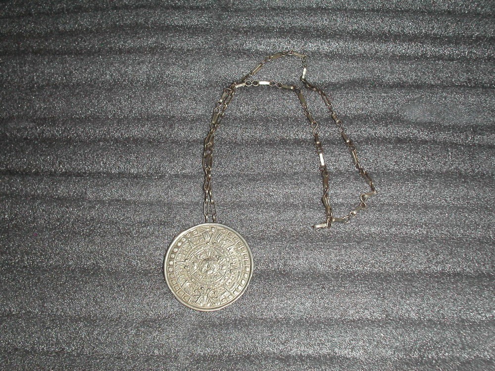 Lant cu medalion din Mexic. Lantul are lungimea de 65 cm si marcajul STERLING MEXICO iar medalionul are diametrul de 5.7 cm, cu calendar aztec in relief si marcajul HECHOEN MEXICO. Medalionul se folosea si ca brosa insa acul este rupt dar ca medalion este bun. A fost testat chimic si nu este argint, cred ca este alpacca, folosit in stare buna.