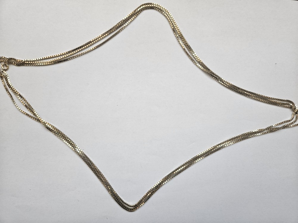 Lant din argint aurit , greutate 22.20 gr, marcaj 835, lungime lant 2 m, poate fi purtat in mai multe moduri, inclusiv in 3 siruri suprapuse asimetrice, in stare excelenta, cumparati cu incredere, orice produs se poate returna! Transport doar prin Posta Romana!