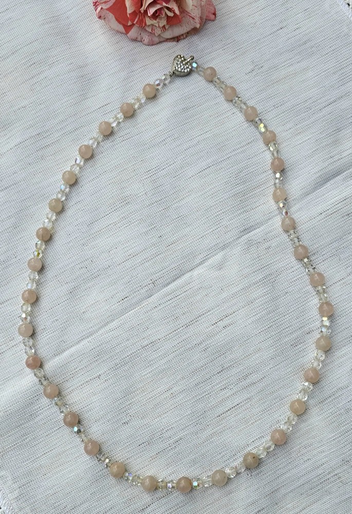 LANT LUNG VINTAGE CU MARGELE MICUTE DIN CUART ROZ SI MARGELE DIN STICLA FATETATA "AURORA BOREALA" CU ÎNCHIZĂTOARE DIN METAL ARGINTIU DECORAT CU CRISTALE.