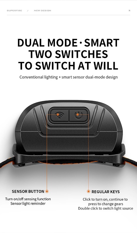 Lanterna Superfire HL05-N este ideala pentru camping, drumetii, pescuit, reparatii auto, lucrari tehnice si situatii de urgenta. Senzorul de miscare permite pornirea/oprirea prin gesturi, fiind extrem de util in conditii in care nu poti atinge lanterna. Lumina rosie si galbena contribuie la pastrarea vederii nocturne si la semnalizare.