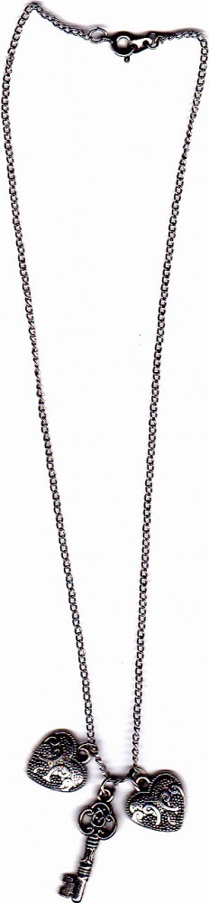 Lantisor copii cu doua inimioare si o cheita. Materialul pare a fi din argint dar nu sunt sigur. Oricum un inox mai finut lucrat.
