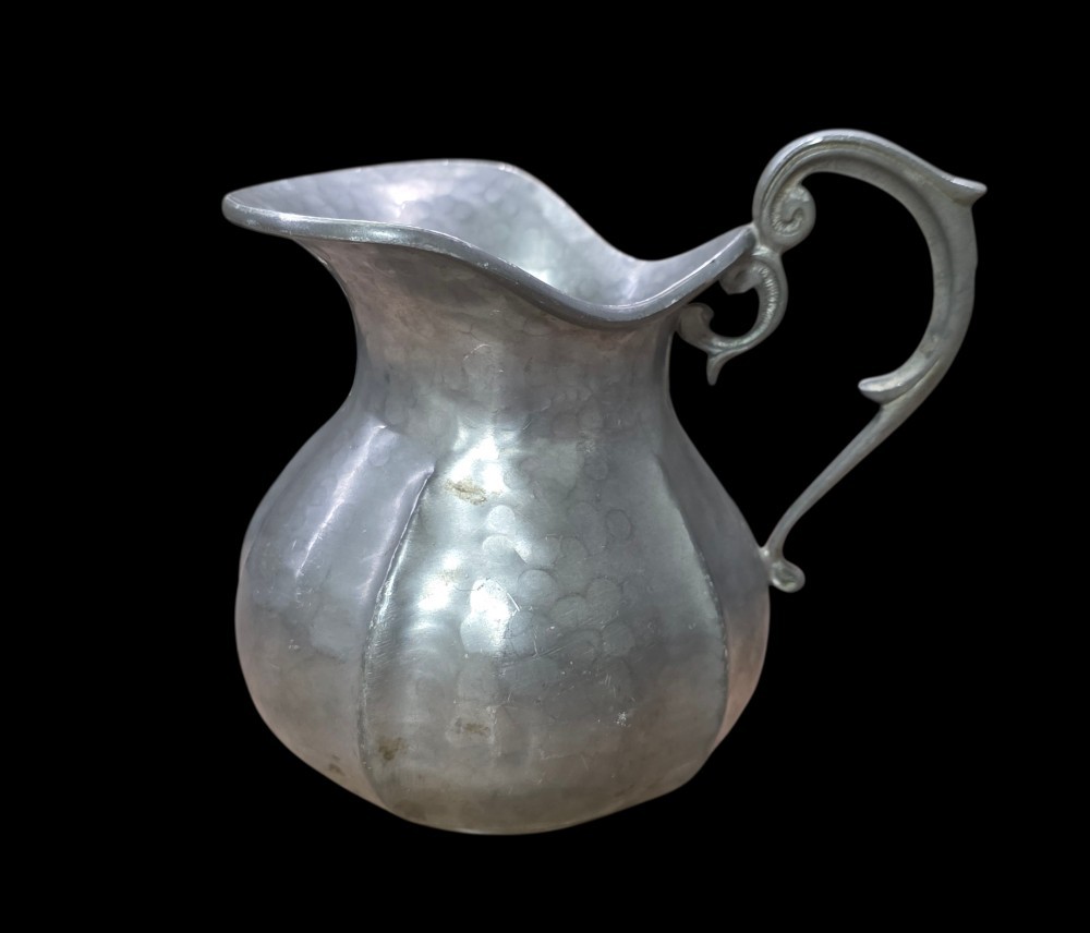 Latiera veche lucrata manual din peltro, decorată cu suprafață ciocănită și toartă curbată cu volute. Formă bombată cu gura evazată pentru turnare.