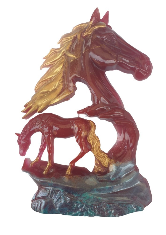 Piesă decorativă handmade, realizată din rășină epoxidică, ce simbolizează puterea, protecția și continuitatea. Compoziția dintre calul adult și mânz exprimă legătura dintre forță și început, dintre experiență și viitor. Culorile intense cu accente metalice oferă profunzime și eleganță, iar fiecare turnare face ca această creație să fie unicat absolut, cu impact vizual puternic.