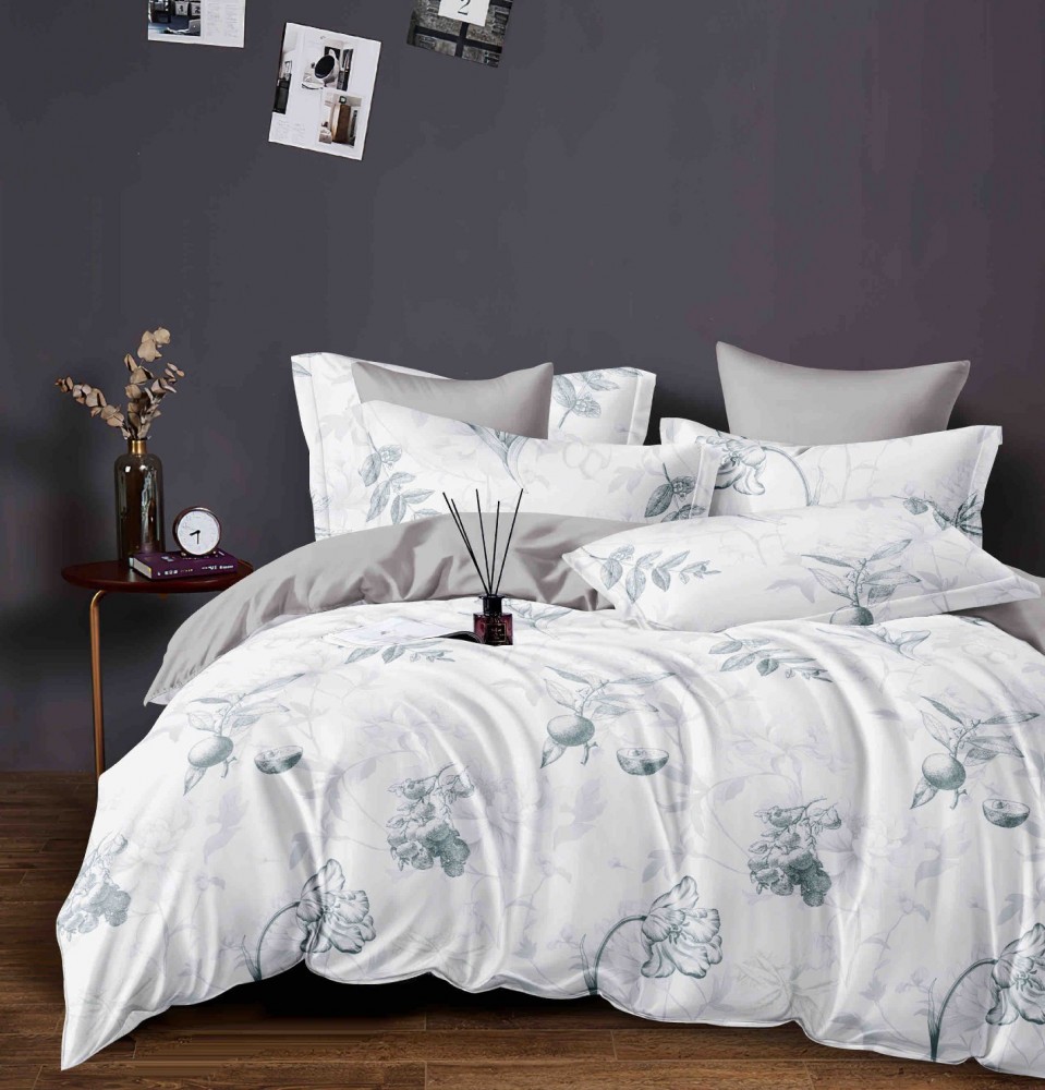 Lenjerie pat dublu,bumbac finet,6 piese,cearceaf cu elastic,alba gri cu flori-A976