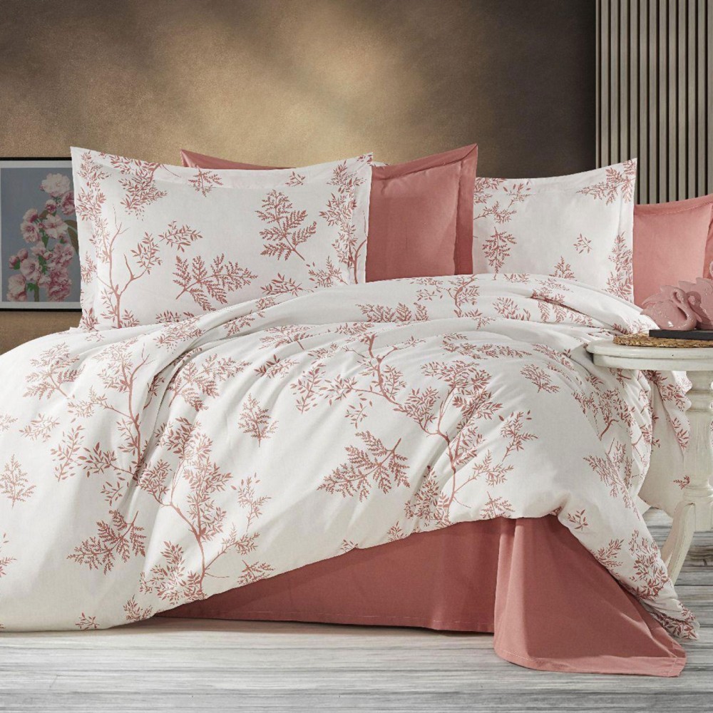 Lenjerie pat dublu,bumbac ranforce,4 piese,alba caramiziu cu flori,RNFN251