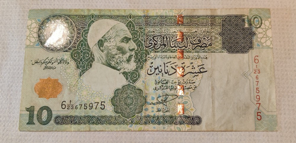 Libia - 10 Dinars / dinari (2004) în stânga Omar el-Mukhtar