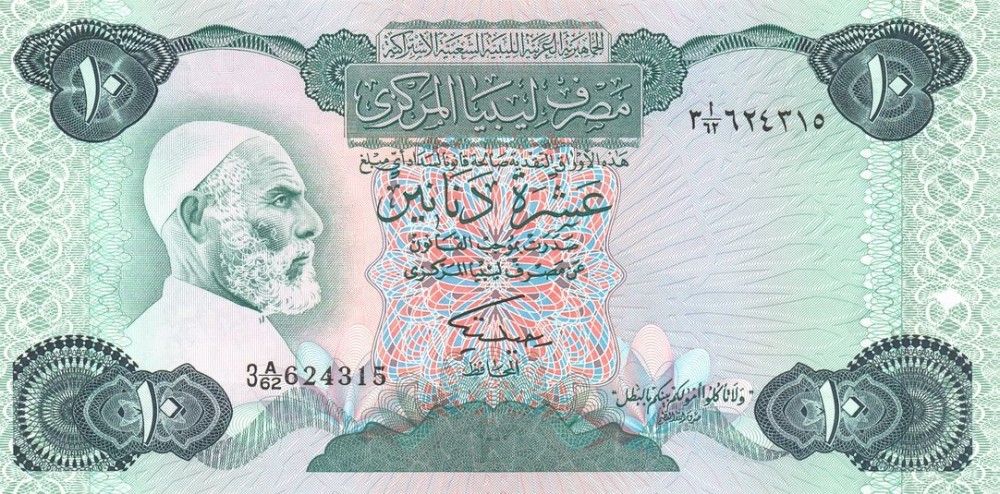 Splendida bancnota de 10 Dinars din Libia 1984 (P-51) în stare necirculatã (UNC) (semnatura: 5).