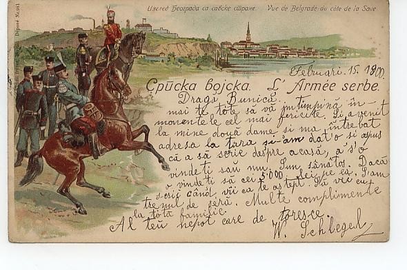 Litografie Belgrad, vederea raului Sava, Militari calare