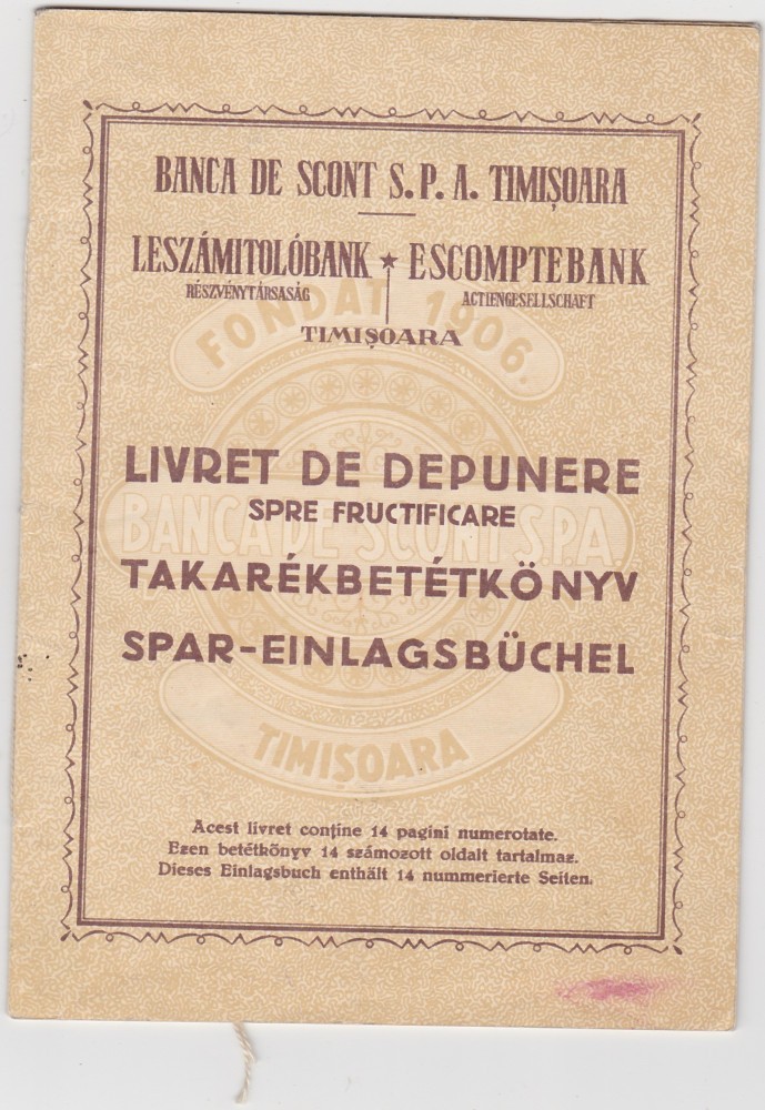 Livret depunere Banca de Scont S.P.A. Timisoara – Fondat 1906 – document bancar original interbelic – multilingv RO/HU/DE