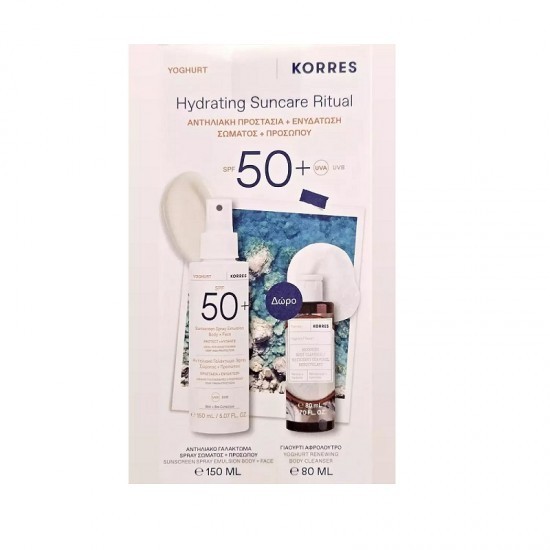 Loțiune spray hidratantă cu protecție solară Korres Yoghurt Suncare Ritual pentru corp și față SPF50+ 150 ml + Demachiant de corp gratuit 80 ml