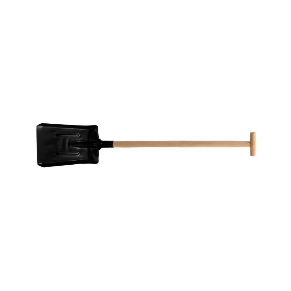 O lopată mare tipică din tablă pentru turnarea cărbunelui, nisipului și a altor aplicații. Înrămat pe un mâner din lemn din lemn de esență tare, lemn condimentat cu mâner tip T.