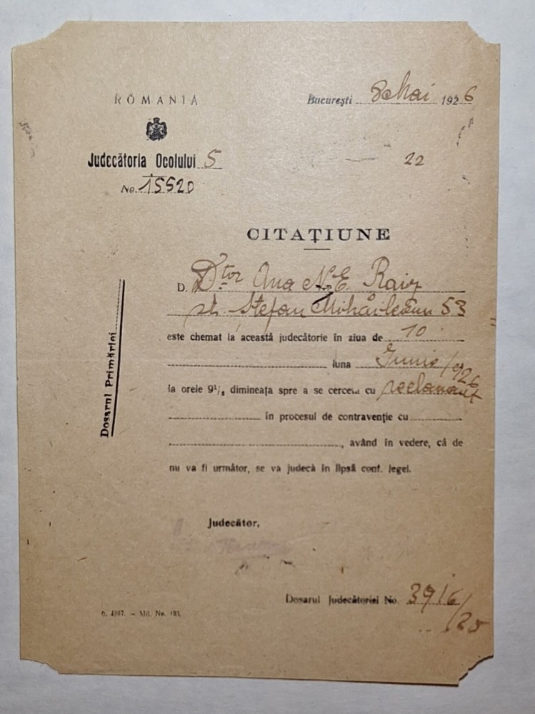 clasică a citațiunilor interbelice: antet cu „ROMÂNIA”, ștampila
