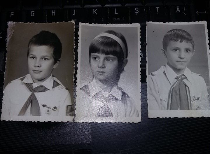 lot 3 fotografii vechi,fetita/baieti tinuta de pionieri cu insigne/cravata,T.GRA