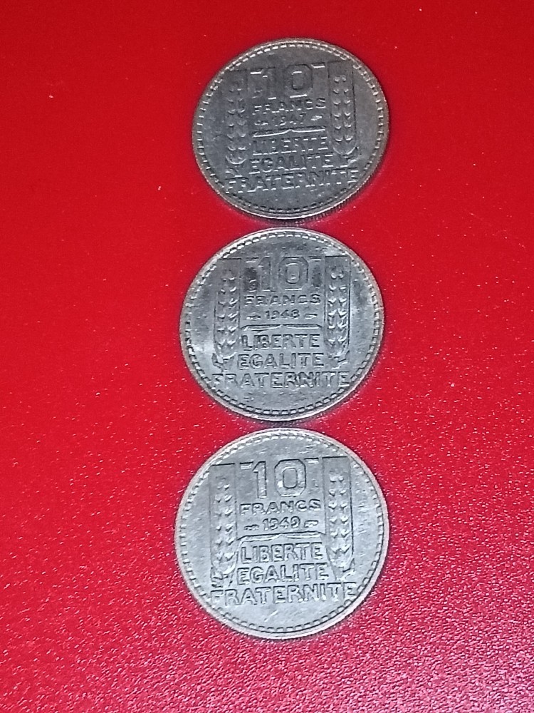 Lot 3 monede Franta: 10 francs 1947 + 1948 + 1949, stari UNC + luciu [poze]. Discount conform descriere [10 - 20 %. Vezi descrierea.].