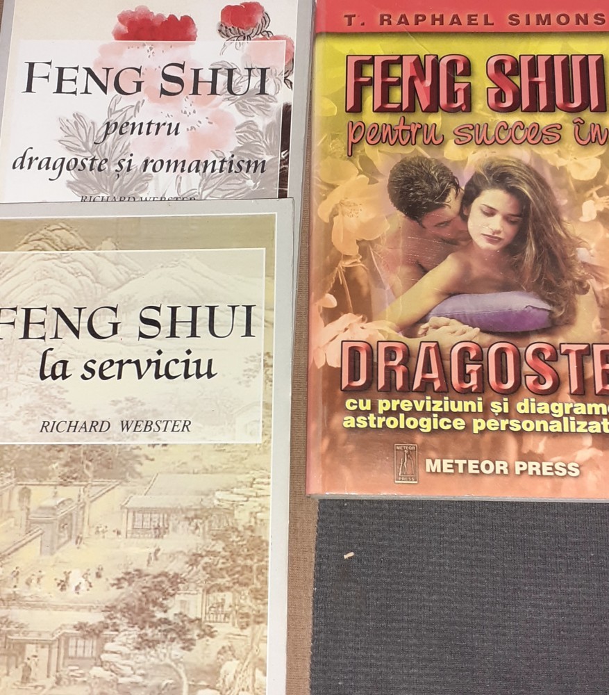 Autor: Richard Webster Titlu: Feng Shui pentru dragoste si romantism Editura: Vox An aparitie: 2000 Nr pagini: 140 Format: 13 x 20 cm Coperti: brosate Carte in limba: romana Stare: buna///////Autor: Richard Webster Titlu: Feng Shui la serviciu Editura: Vox An aparitie: 2004 Nr pagini: 142 Format: 13 x 20 cm Coperti: brosate Carte in limba: romana Stare: buna///////////Autor: T. Raphael Simons Titlu: Feng Shui pentru succes in dragoste Editura: Meteor Press An aparitie: 1999 Nr pagini: 230 Format: 13 x 20 Coperti: brosate Carte in limba: romana Stare: buna