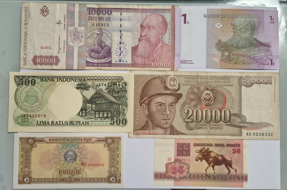 Romania 10000 lei 1994 seria B0074-016915 circulata Iugoslavia 20000 dinari 1987 circulata Congo 1 centime 1997 UNC Indonezia 500 rupiah 1992 UNC Cambodgia 1 riel 1979 UNC Belarus 25 ruble 1992 UNC Plata în avans prin mandat poștal.Transportul de comun acord.