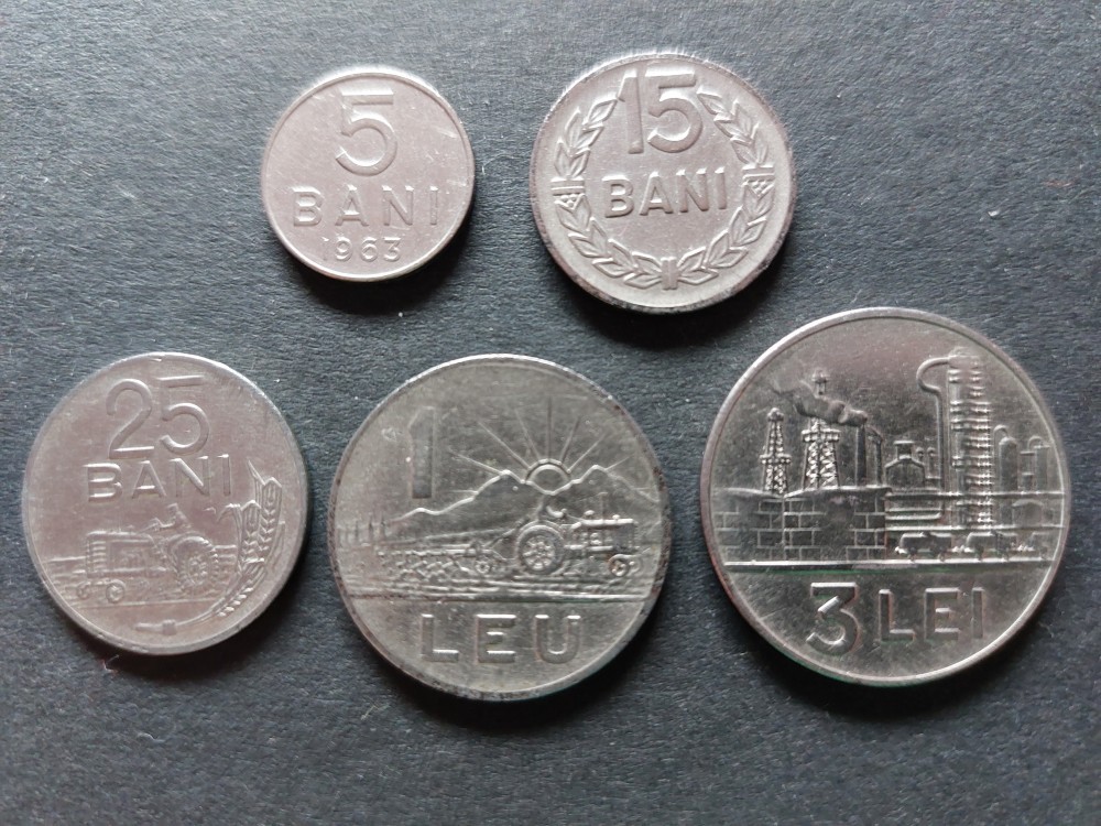 Lot monede 5 bani 1963,15 bani 1960,25 bani 1960,1leu 1963,3 lei 1963 R.P.R.