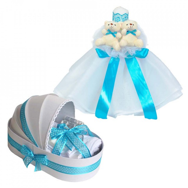 Lumanare botez tul alb cu ursuleti si trusou botez in landou, decor Turcoaz, Denikos® 600