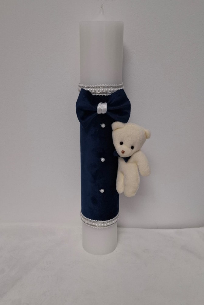 Lumanare de botez (35x6 cm), decorată cu catifea albastru imperial și ursuleț