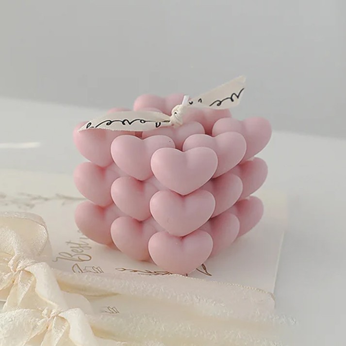 Lumanare Parfumata Decorativa, Model Abstract Cub din Inimioare, Lumanare pentru Diferite Ocazii, 6 x 5.5 cm, Aroma de Oregano si Narcise, Roz