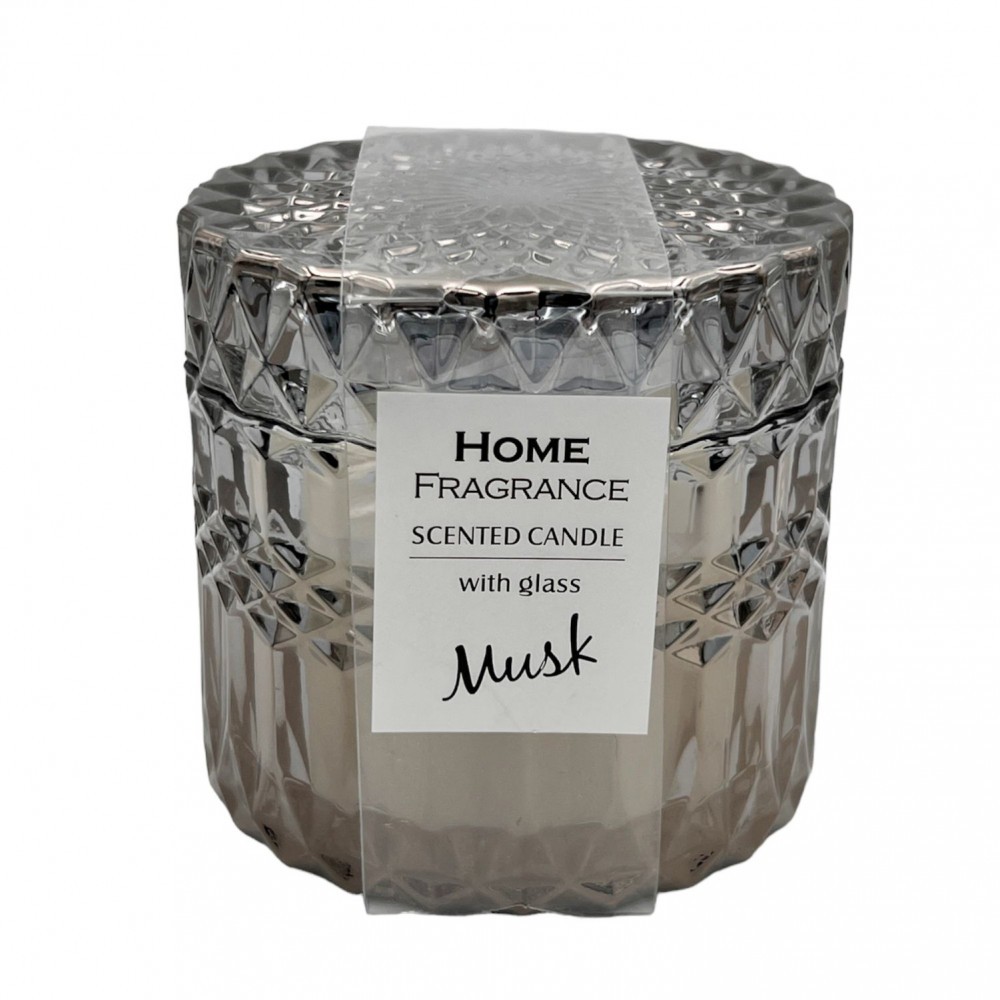 Lumanare parfumata MUSK in bomboniera sticla, 9x9 cm Aceasta lumanare parfumata MUSK, aduce o atmosfera unica in casa ta. Parfumul captivant de acasa este extrem de important nu numai pentru oaspeti, ci si pentru relaxare. Aceasta lumanarea parfumata are paharul din sticla, sub forma de bomboniera si se mandreste cu un parfum de MUSK Dimensiuni: 9x9 CM