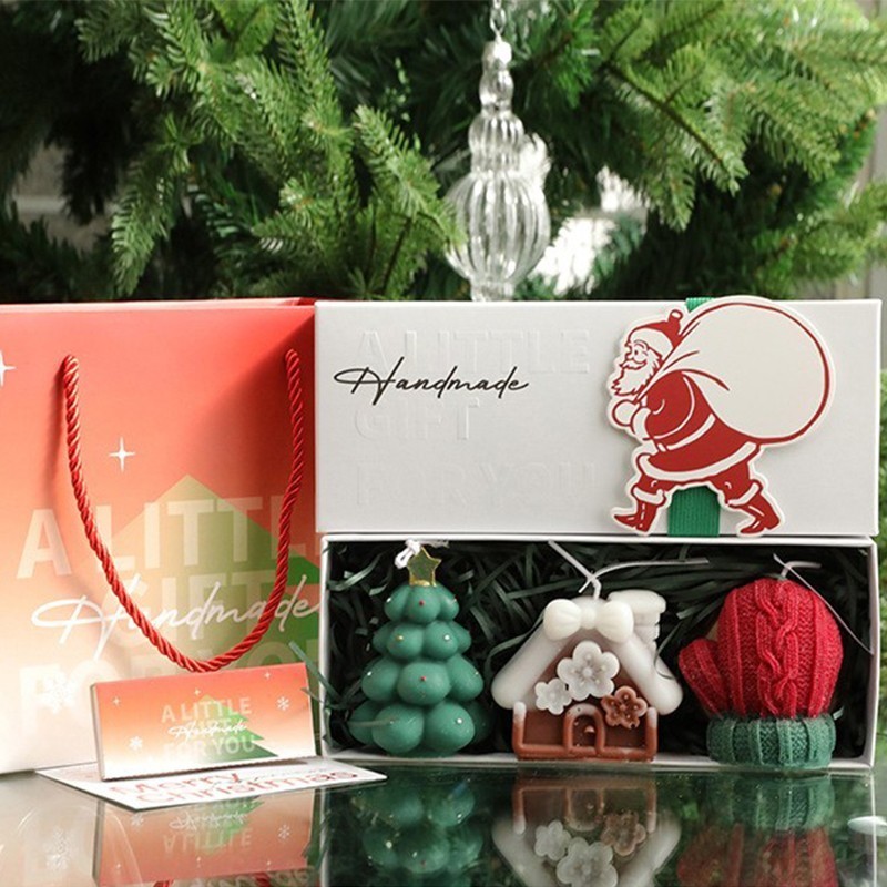 Lumanari Parfumate de Craciun, GIFT BOX din 3 Lumanari din Ceara de Soia, Model B Brad, Manusa, Casuta, 22.5 x 9.5 x 5 cm, Multicolor