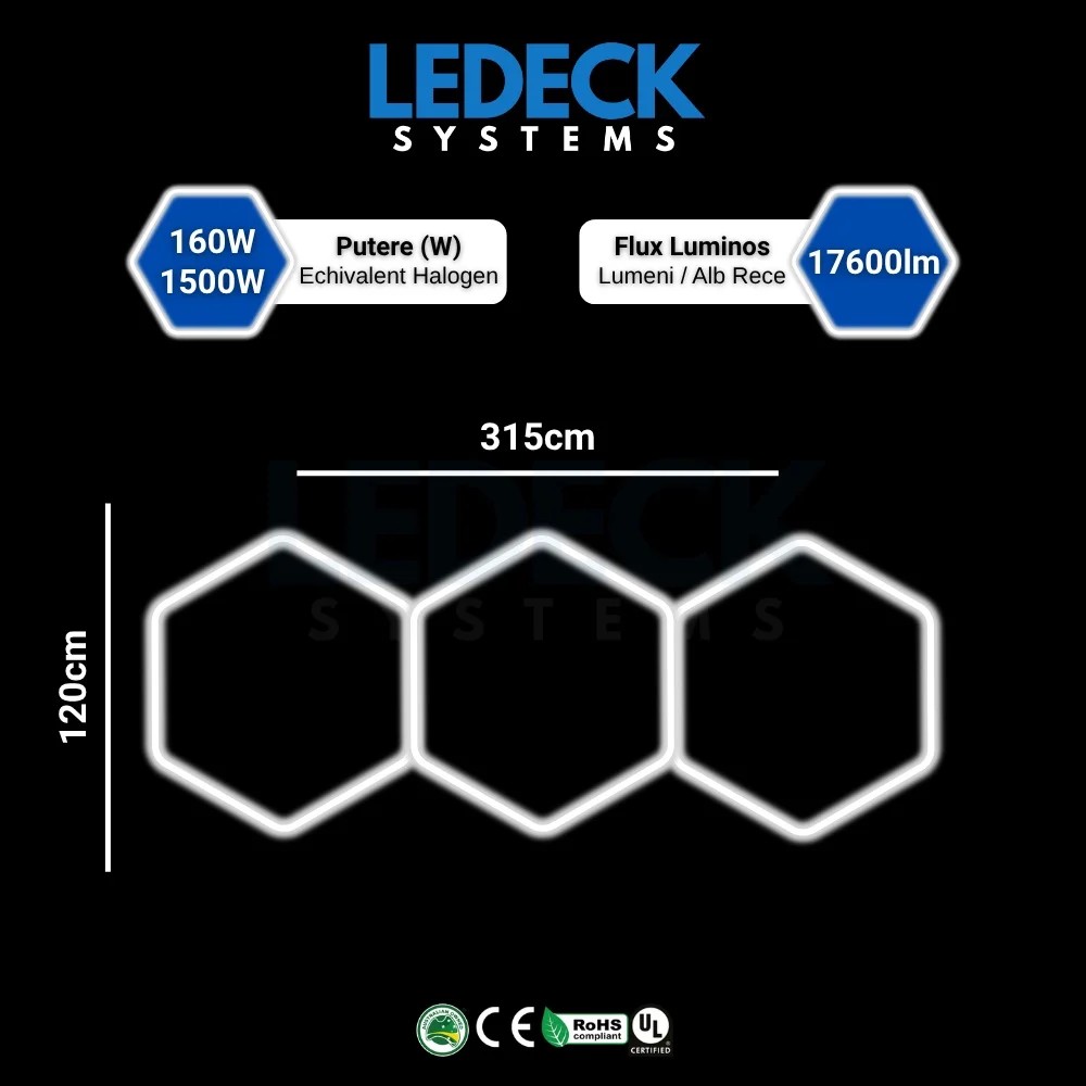 Lumină LED Hexagonală Profesională Aluminiu– 3 Module 120x315CM – Service Auto,