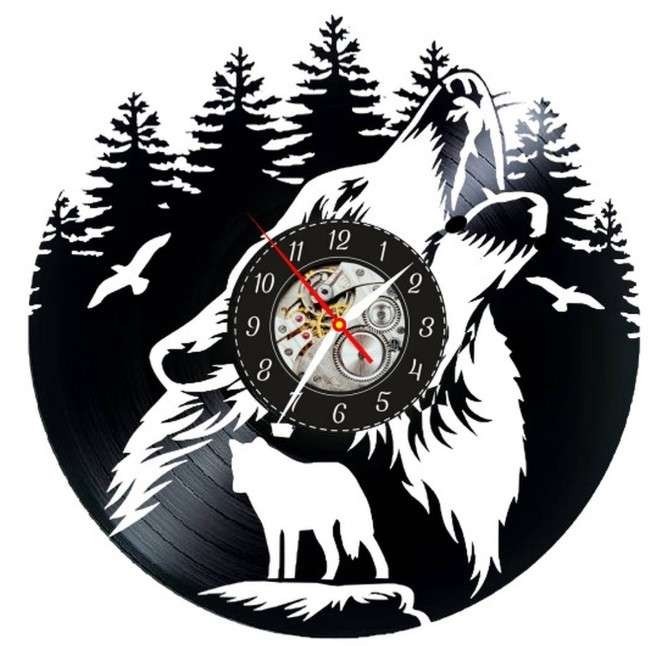 Ceas de perete cu tematică sălbatică și atmosferă de legendă nordică. Realizat din vinil decupat artistic, ilustrează doi lupi: unul în prim-plan, urlând spre cer, celălalt veghează de pe o stâncă. Fundal cu păduri, păsări în zbor și un mecanism cu rotițe vizibile – parcă inspirat de mișcarea haitei prin timp.