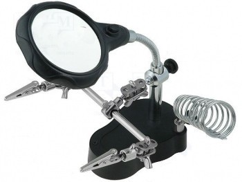 Lupa 65mm cu suport PCB si iluminare HH3 suport PCB cu lupă Diametru lentilă 65mm Sursă de alimentare 3 baterii 1,5V LR03 (AAA) lipire SMD lipire THT imobilizarea PCB şi a componentelor în timpul lipirii şi examinării baterii lupă iluminare LED stativ pt. ciocan de lipit două lentile de mărire elemente de fixare sub formă de cleme de arc lupele facilitează observarea spaţiului de lucru reglare înălţime fixare, distanţă, unghi de fixare, poziţie lupă sistem de braţe cu 2 articulaţii