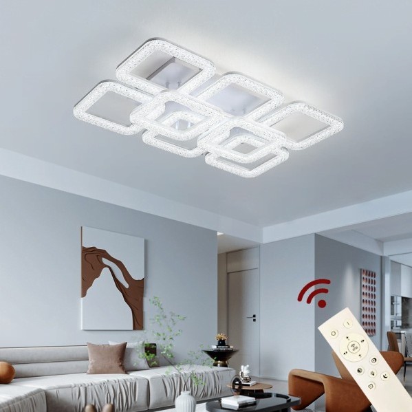 Lustra LED 128W, 6+2 patrate cu cristale, telecomanda, lumina/rece/calda/neutra, intensitate reglabila