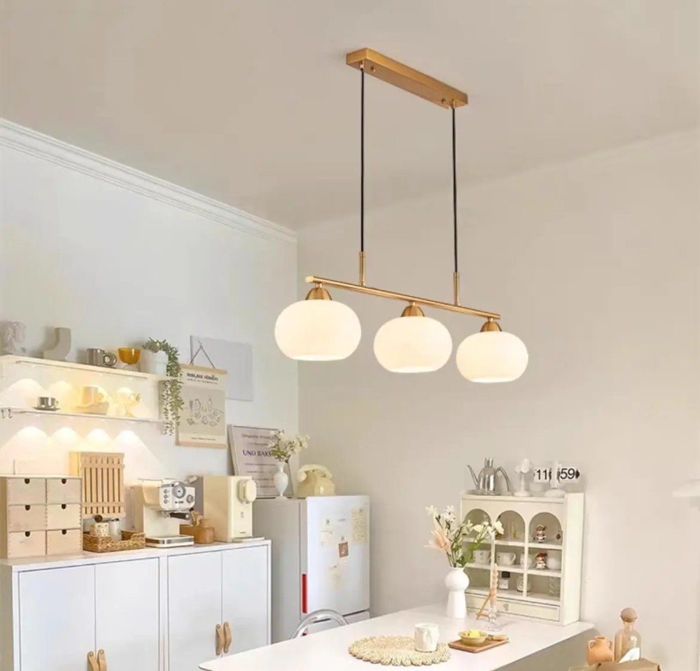Lustra moderna cu 3 globuri din sticla alba, auriu, dulie E27, inaltime reglabila