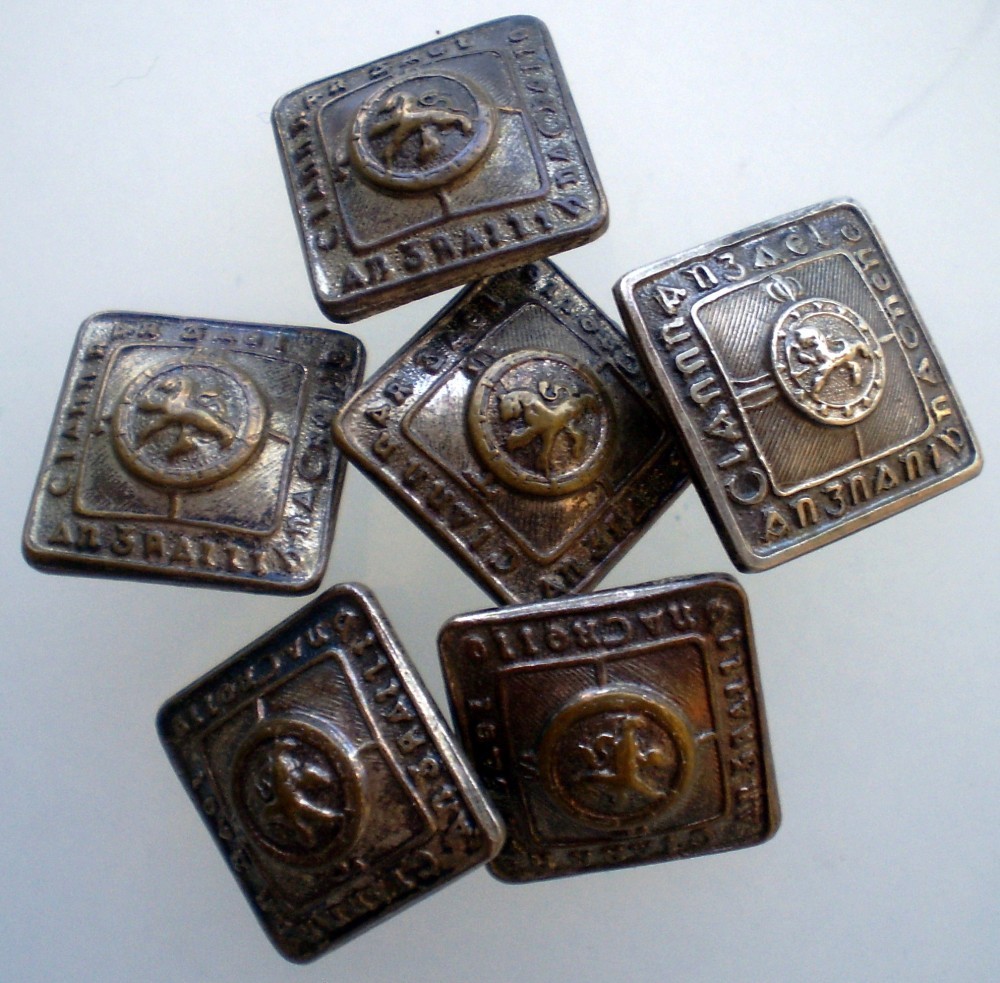 Dimensiuni aproximative 18,5/18,5mm (5 buc – metal galben patinat) și 20/20mm (1 buc – metal alb patinat). Nasturele mai mare e marcat pe foto. Nasturii arata exact ca în foto.