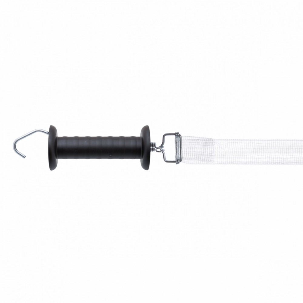 Mâner pentru poartă gard electric, cu cârlig și arc, potrivit pentru bandă 40 mm. Mâner pentru poartă gard electric, cu cârlig și arc, prevăzut cu conector pentru bandă 40 mm. Aproape în fiecare sistem de gard electric este nevoie de un mâner de poartă pentru a permite trecerea prin gardul aflat sub înaltă tensiune. Arcul aflat în interiorul mânerului asigură tensionarea corectă a firului gardului. Este recomandat folosirea tuturor accesoriilor destinate pentru construcția porții împreună cu mânerul de poartă.