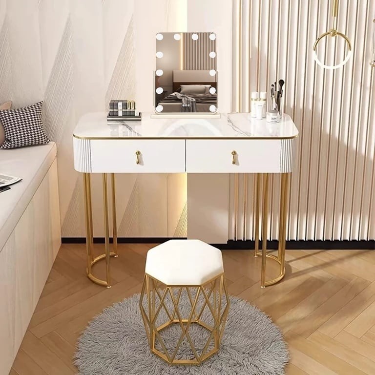 Măsuță make-up cu oglindă Hollywood, cu scaun tip cuib de barză cu 2 sertare de culoare albă, soluția Ideală pentru un Machiaj - AlpinCool™