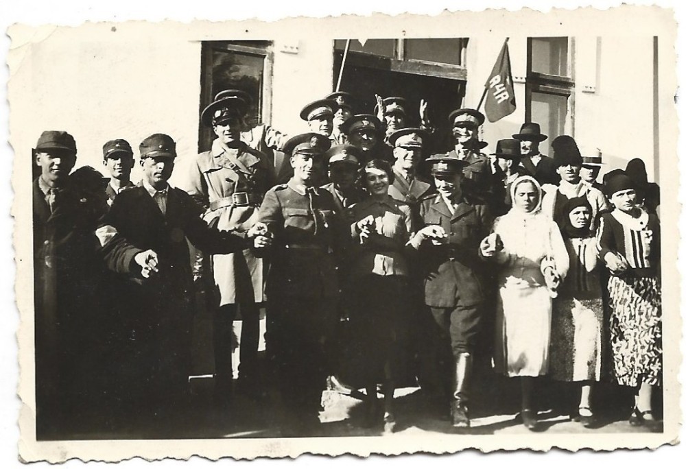 M1347N Cavaleriști din Regimentul 4 Roșiori Regina Maria în horă cu civili, pe clădire fanion neregulamentar cu abrevierea regimentului (R4R), 1937