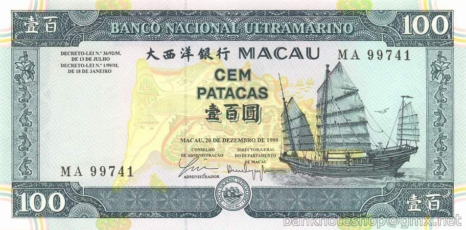 Splendida bancnota de 100 Patacas din Macau 1999 (P-73) (Banco National Ultramarino) în stare necirculatã (UNC).