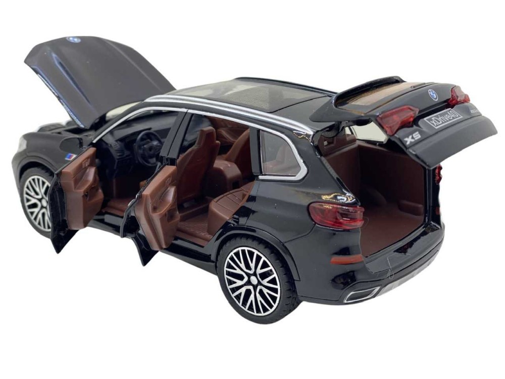 Macheta Bmw X5 negru 1:32 care deschide toate usile inclusiv capota motorului si portbagajul. Machetele au sunet si lumini inclusiv stopuri spate care se aprind. Toate acestea sunt alimentate de 3 baterii AG13 incluse in partea din fata a masinutei. Calitate exceptionala! Masina nu are cutie proprie, vin de la producator mai multe culori pe cutie mai mare. Recomandat copiilor cu varsta peste 3 ani Material metal, parti plastic si roti cauciuc