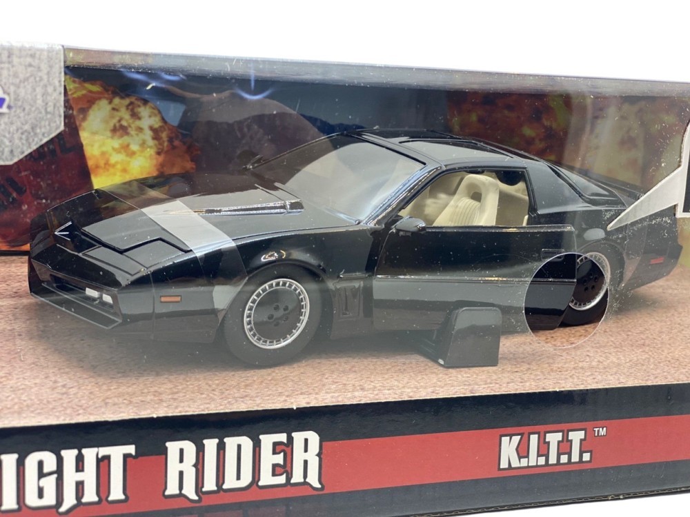 Macheta metal Pontiac Firebird Knightrider Kitt with working lights on the front hood, black 1/24. Deschide capota si usile. Macheta are sunete si lumini. Este un produs original cu licenta Jada. Este recomandat copiilor peste 8 ani.