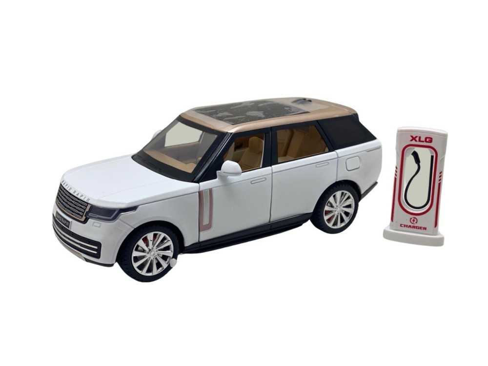 Macheta metal Range Rover alb auriu deschide toate usile, capota si portbagaj 1/24 Masinuta are sunete de motor si alarma care se activeaza la deschiderea usii soferului. Ca o dotare importanta enumeram si lumini cu led in faruri si in stopurile masinii, resort. Setul contine macheta plus o statie de incarcare electrica din plastic. Recomandata copiilor cu varsta peste 3 ani.