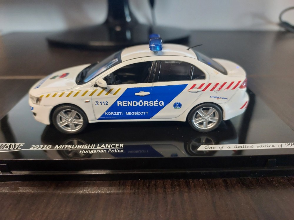Vand macheta MITSUBISHI LANCER EVO X 2010 POLITIA UNGARIA - produsa de Vitesse, noua, scara 1/43, editie limitata - 999 buc. cu postament + vitrina, in cutia originala.