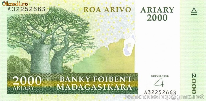 Splendida bancnota de 2000 Ariary din Madagascar 2009 în stare necirculatã (UNC) (P-90b) (semnatura: Frederic Rasamoely) (serie A).