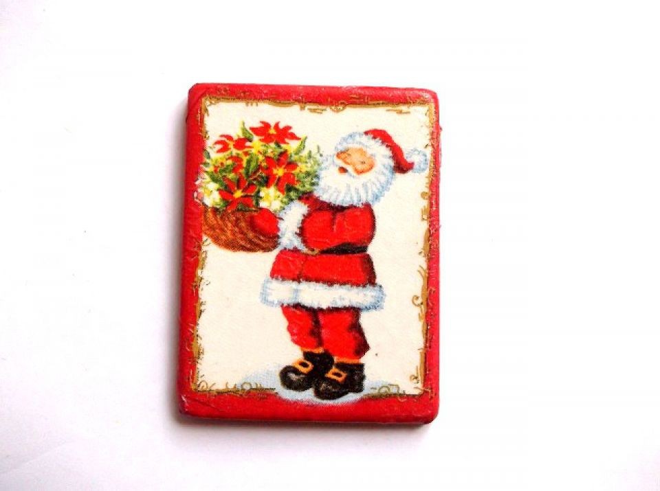 Magnet frigider din ipsos. Produs lucrat manual din categoria decoratiuni interior casa. Dimensiuni: lungime 7,5 cm si latime 5,5 cm. Design cu Mos Craciun si cos cu flori. Culori: rosu, galben, verde si maro.