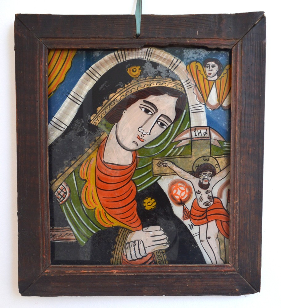"Maica Domnului Indurerata" icoana pe sticla de Scheii Brasovului sfarsit de secol XIX