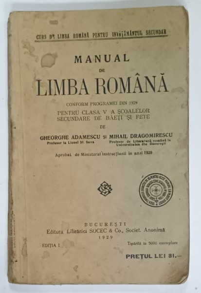 MANUAL DE LIMBA ROMANA de GHEORGHE ADAMESCU si MIHAIL DRAGOMIRESCU , 1929 , PREZINTA PETE PE COPERTA