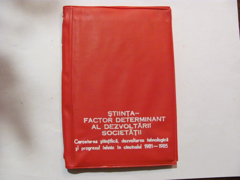 Mapa (goala, fara diapozitive) / Coperta / Etui pentru diapozitive / "Stiinta - Factor Determinant al Dezvoltarii Societatii / Cincinalul 1981 - 1985" - plastic; functional; dimensiuni: 12,50 cm x 17,50 cm; greutate: 110 g; stare (foarte) buna, estetica frumoasa; contine 4 file complete (din 5, cate ar fi trebuit sa fie complete), a cate 6 loacasuri fiecare; a 5-a fila (prima in ordine cronologica) a fost decupata, si mai contine doar 2 locasuri; articol fabricat in Romania, perioada comunista. (CY)